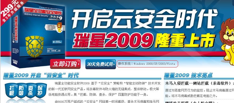 http://www.rising.com.cn/2009/release/index.html而且瑞星以前版本的升级到安全套装还得购买升级专用版,是只能买盒装的吗?还是能网上购买?真是太麻烦了,好不容易盼来2009安全套装,但是升级这么麻烦!!!