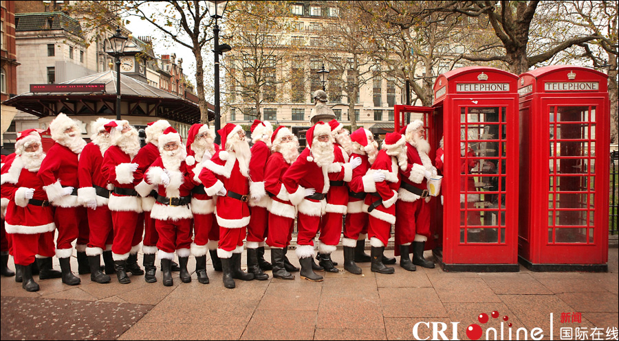 伦敦:2008年11月13日,一群圣诞老人集体出现在英国伦敦街头,他们排队在英国莱斯特广场电话亭打电话;然后集体买票,在英国最大的连锁电影院——欧点影院看了一部有关圣诞老人的电影:《圣诞老人学校:电影》。每年圣诞节前一个多月,英国伦敦的圣诞老人学校就会开设课程,让圣诞老人们学会如何穿衣、打扮,如何更好地诠释圣诞老人的性格特点,甚至要记住每只驯鹿的名字。(图片来源:CFP)