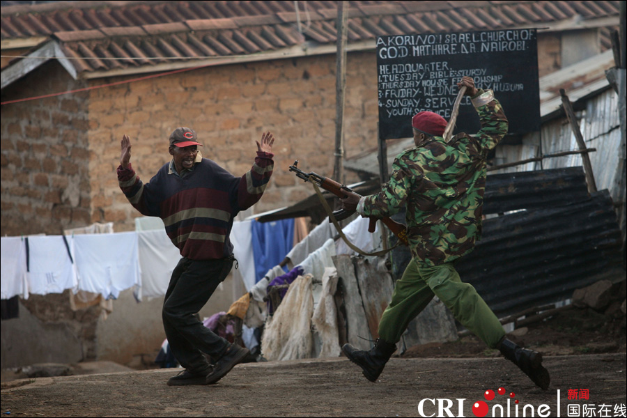 肯尼亚奈落比:2007年12月肯尼亚举行大选,反对党指责当选总统在选举中作弊,并拒绝承认选举结果,引发全国性暴力骚乱,造成至少600多人死亡。图中是2008年1月16日,一名肯尼亚警察追赶Mathari贫民窟一名居民。(图片来源:CFP)