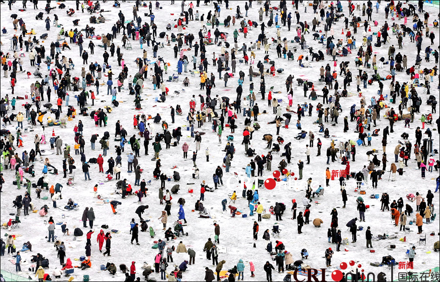 韩国华川:2008年1月13日,韩国众多钓鱼爱好者齐聚韩国华川参加“华川山川鱼节”的钓鱼比赛。山川鱼实际上是鲑鱼的一种,性喜冷水。“华川山川鱼节”每年都吸引近百万游客前来,他们将鱼钩透过冰孔放入冰冻的河水中静等鱼儿上钩,几十万人共同钓鱼的场面实在壮观。(图片来源:CFP)