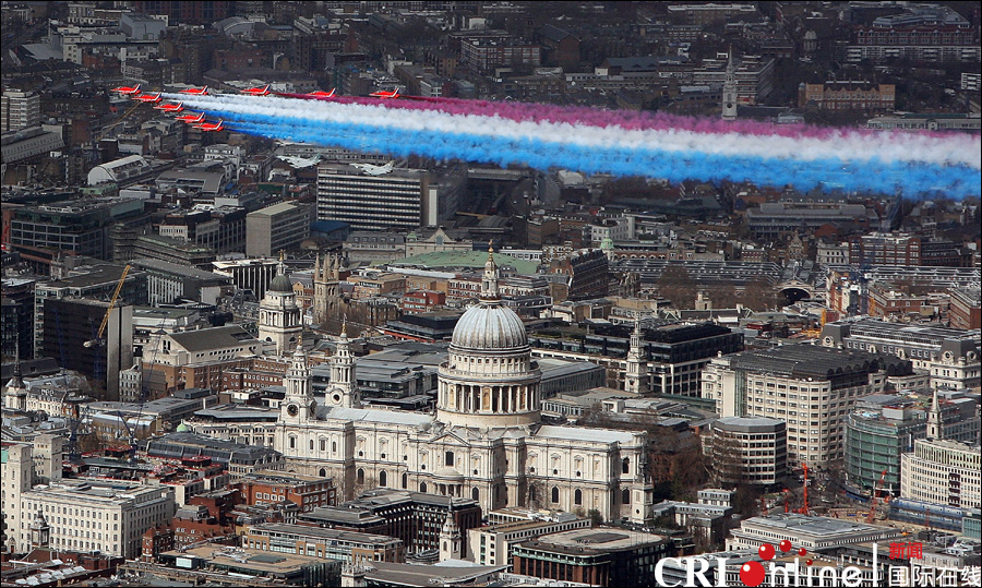 伦敦:2008年4月1日,英国皇家空军“红箭”特技飞行表演队与4架“台风”战斗机进行编队飞行表演,以庆祝英国皇家空军成立90周年(1918年成立)。“红箭”特技飞行表演队列队飞过伦敦中心上空,标志着纪念活动正式开始。“红箭”飞行表演队成立于1965年,已在50余个国家和地区进行了超过4000场飞行表演。(图片来源:CFP)
