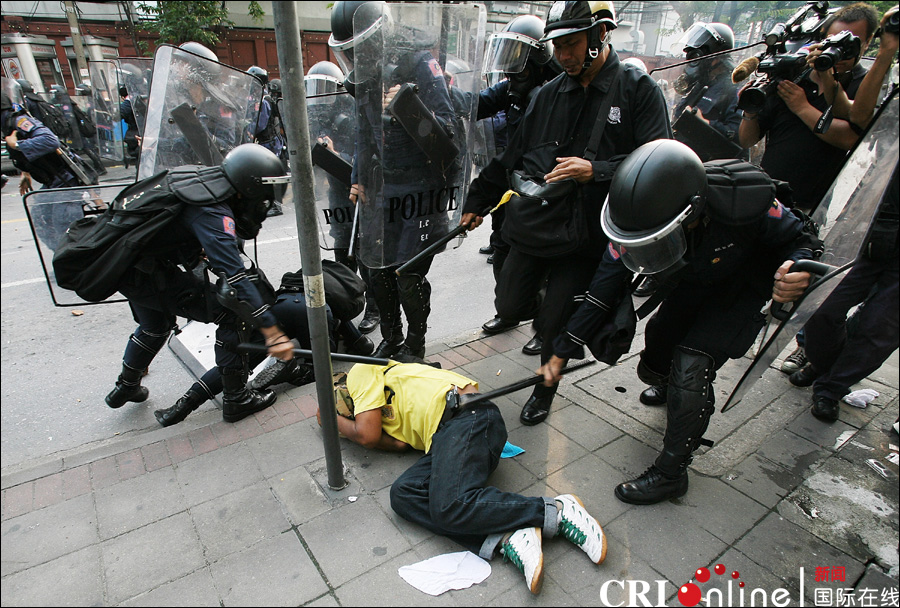 泰国曼谷:2008年10月7日,数千名人民民主联盟的支持者在曼谷街头与维持秩序的泰国防暴警察发生冲突,警方使用催泪瓦斯驱散国会大厦外面的抗议人群,让政治家们安全离开。图中,防暴警察正在国会大厦外面制止一名反政府抗议者。(图片来源:CFP)