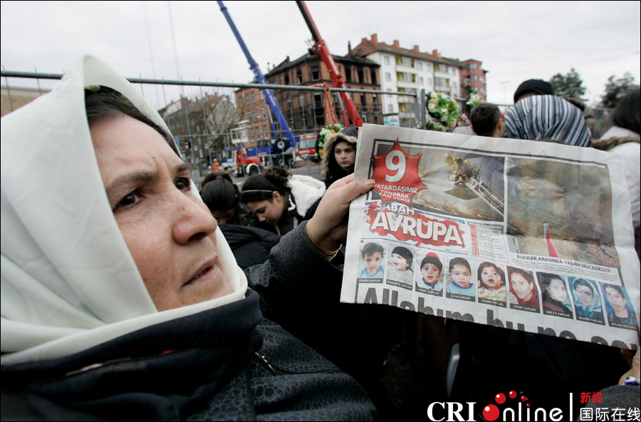 德国路德维希:2008年2月5日,一栋公寓大楼突然起火,9人被烧死,另有30多人受伤,其中2人伤势严重。图中,一名火灾幸存者的亲戚向记者展示一份土耳其报纸,报纸后面就是起火的公寓。(图片来源:CFP)