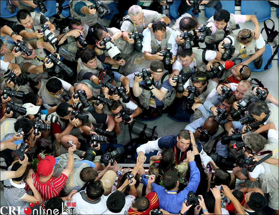 北京:2008年8月17日,也就是北京奥运会第九天,美国游泳健将迈克尔·弗雷德·菲尔普斯获得男子4x100混合泳金牌。通过四周围着的记者和摄影师,在国家游泳中心问候自己的家人。美国游泳队此次创造了新的世界纪录。(图片来源:CFP)