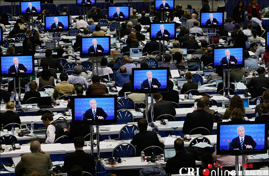 纽约亨普斯特德:2008年10月15日,美国共和党总统候选人麦凯恩与民主党对手奥巴马举行第三场电视辩论,记者们被安排到霍夫斯特拉大学的大卫·马克体育馆和展览中心观看辩论。这是美国大选投票日前,两位总统候选人的最后一次直接交锋。(图片来源:CFP)