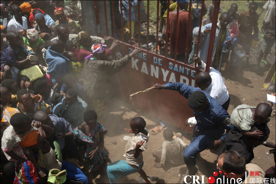 刚果戈马:2008年11月1日,当刚果难民们试图冲进美国国际开发署旁边的救助中心时,一名刚果警察用警棍殴打一名女孩。图西族叛军首领洛朗·恩孔达强迫数千民众逃离家园,前往难民营避难。10月29日,刚果军队威胁解散,而联合国维和部队也已经力有未逮,联合国安理会为此就刚果局势持续恶化举行紧急会议,商讨解决办法。(图片来源:CFP)