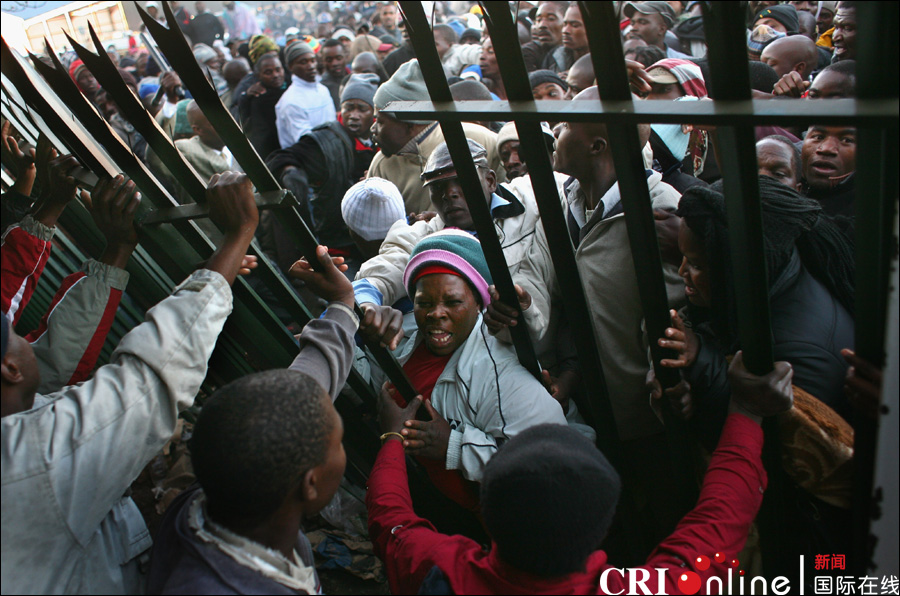 南非约翰内斯堡:由于津巴布韦局势日益陷入混乱,众多津巴布韦民众逃往邻国避难。2008年6月17日,数千津巴布韦移民冲过南非城市约翰内斯堡难民收容中心大门。尽管此前南非刚刚发生排外骚乱,但依然不能阻止津巴布韦移民大量非法涌入南非。(图片来源:CFP)
