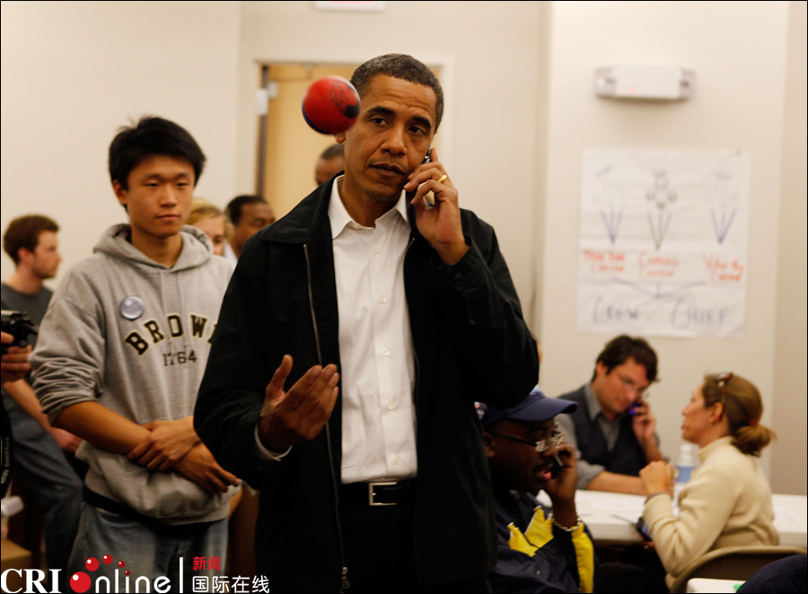 北卡罗来纳州夏洛特城:2008年11月3日,美国民主党总统候选人贝拉克·奥巴马在前往北卡罗来纳大学参加集会前,访问了一个竞选办公室,他一边听着电话一边抛玩着手里的球。尽管到投票日之前,民调显示奥巴马的支持率依然领先于对手麦凯恩,但他依然没有停止举行各种拉票活动。(图片来源:CFP)