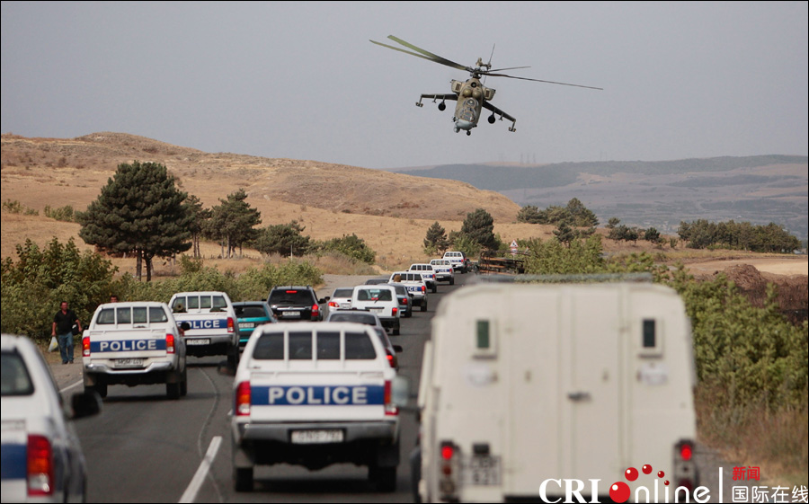 格鲁吉亚戈里:2008年8月份,俄罗斯与格鲁吉亚爆发大规模武装冲突,直到8月14日俄罗斯宣布撤军。就在俄罗斯与格鲁吉亚军队磋商结束冲突期间,两国关系依然非常紧张。一架俄罗斯武装直升机盘旋在格鲁吉亚警察和国际记者车队上空。(图片来源:CFP)