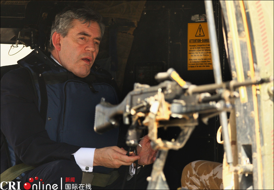 伊拉克巴格达:2008年7月19日,英国首相布朗身穿防弹衣,乘坐直升机突然造访伊拉克。布朗到达巴格达绿区后,与伊拉克总理马利基和其他领导人举行了会谈。(图片来源:CFP)