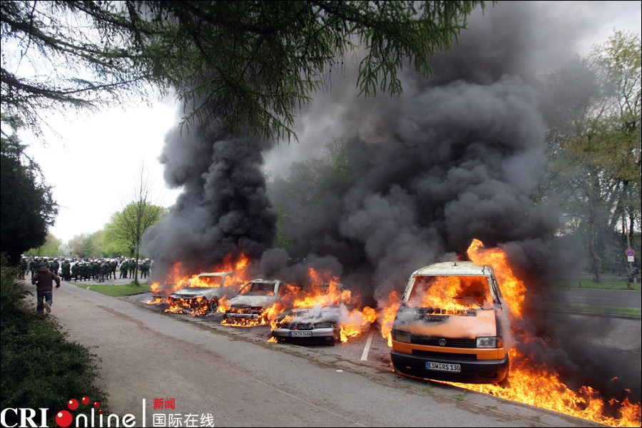 德国汉堡:2008年5月1日国际劳动节期间,数辆汽车在德国汉堡着火,起火原因目前依然不清楚。(图片来源:CFP)