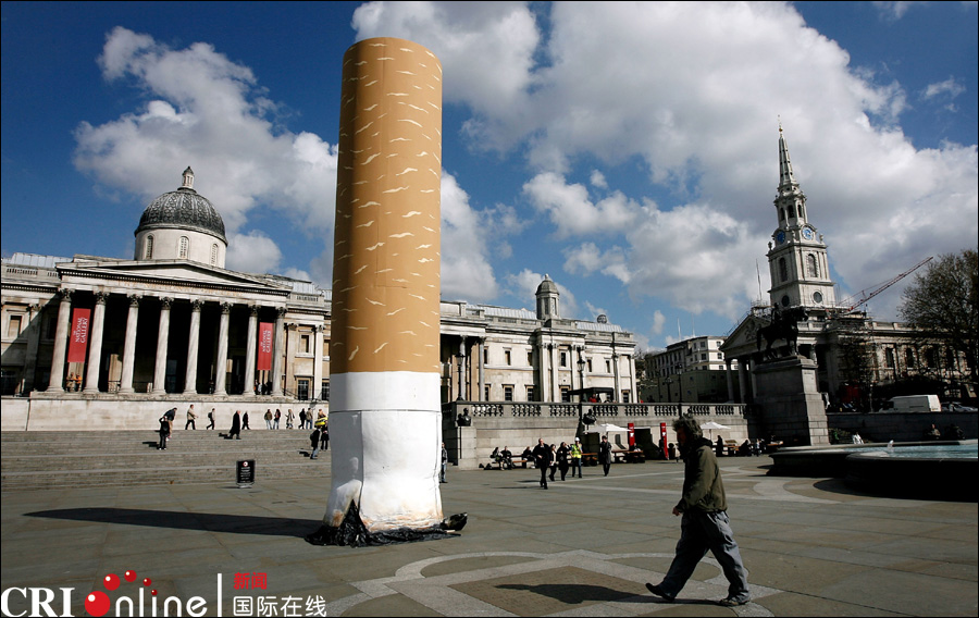 伦敦:2008年4月8日,支持“清洁不列颠” (Keep Britain Tidy) 运动的工人,在特拉法尔加广场放置了一支巨大的“烟屁股”,以此强调这样一个事实:与香烟有关的垃圾影响着英国78%的街道卫生和市容。(图片来源:CFP)
