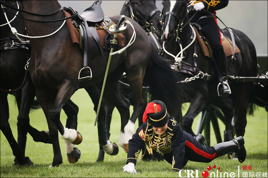 伦敦:2008年4月21日,为了纪念伊丽莎白女王82岁生日,英国皇家骑马礼炮队在海德公园举行阅兵式。当阅兵式开始时,一名年轻礼炮队员突然从疾驰的马上跌落下来。所幸这位骑手并未受伤,还满面带笑地重新回到队列中。(图片来源:CFP)