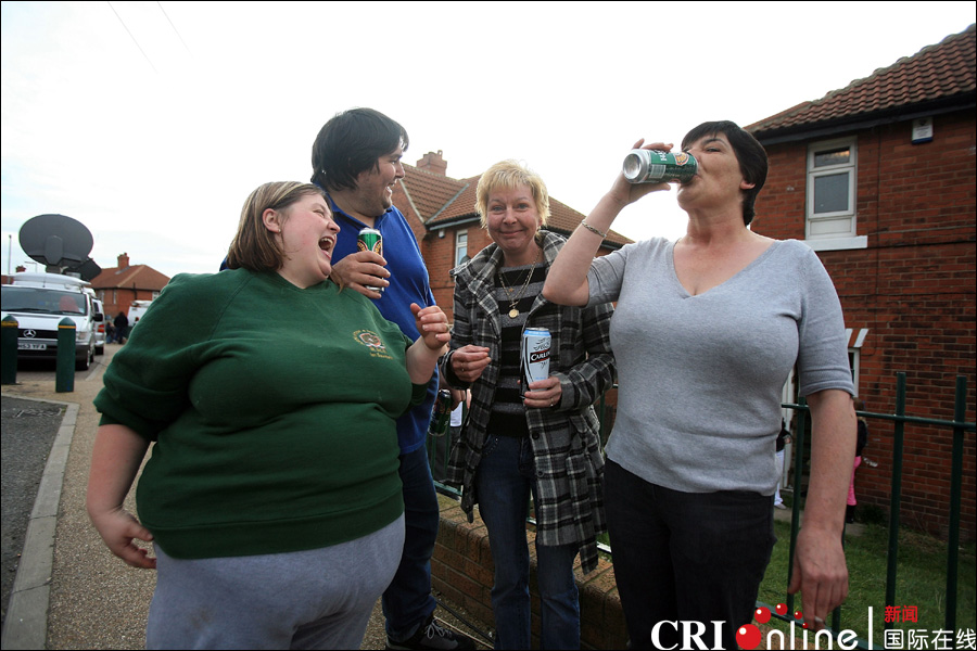 英格兰迪斯伯里:2008年3月14日,9岁女童沙浓·马修斯的邻居和朋友们庆祝她失踪三天后重新出现。(图片来源:CFP)