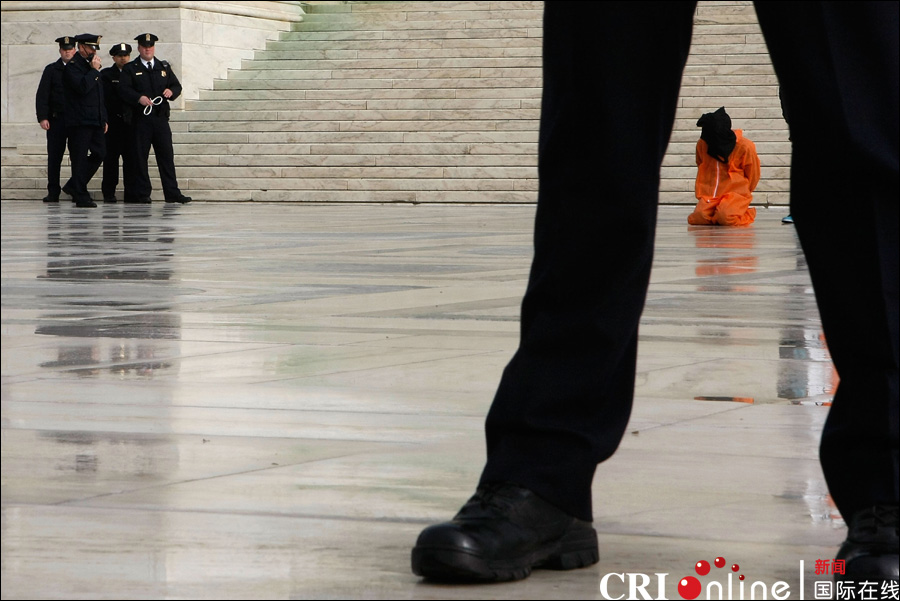 华盛顿:2008年1月11日,美国警察逮捕了一名身穿橙色连身衣、头蒙黑巾的激进分子,他当时跪在美国最高法庭前面。在此期间,几个激进组织参加抗议美国将恐怖嫌犯送入关塔那摩监狱6周年。(图片来源:CFP)