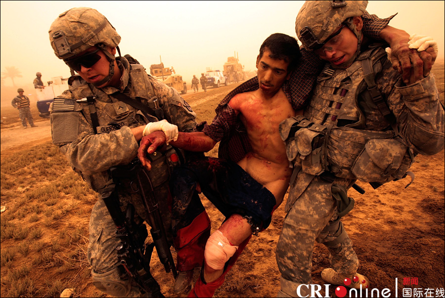 伊拉克巴格达:2008年5月16日,在一场伊拉克沙暴中,美军第十山地师第三十步兵团第二营上等兵乔舒亚·格瑞罗和列兵亚伦·里瓦斯,正抬着一名受伤的伊拉克人。当时格瑞罗所在的巡逻队看到三名伊拉克人行为可疑,其中一人见到美军立刻逃跑,被击中腿部,被送到附近的美军医疗基地。另外两人遭到逮捕,随后被释放。(图片来源:CFP)