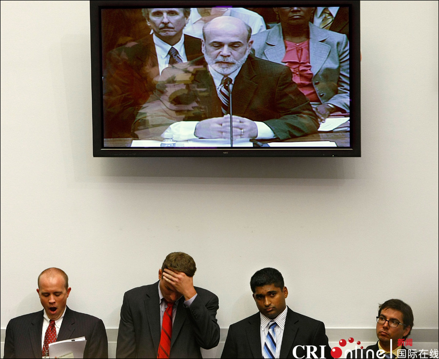 华盛顿:2008年9月24日,在美国众议院金融服务委员会听证会上,美联储主席本·伯南克首先出现在电视中。随后,美国布什总统公布了他的7000亿美元救市计划,用以稳定美国蹒跚不前的金融系统。国会中的许多议员对此项计划表示愤怒,他们称这是“用纳税人的钱补偿华尔街错误造成的损失”。(图片来源:CFP)