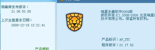 瑞星版本:21.17.52,防火墙和杀毒都是!