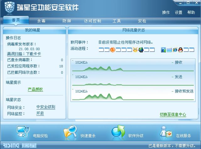 基于瑞星“云安全”(Cloud Security)计划和“智能主动防御”技术开发的新一代信息安全产品,采用了全新的软件架构和最新引擎,全面优化病毒特征库,极大提高了运行效率并降低了资源占用。 该产品完全互联网化,并实现了杀毒软件、个人防火墙等产品的无缝集成,针对目前木马病毒和黑客攻击等各种网络威胁,为用户提供集“拦截、防御、查杀、保护”为一体的个人电脑安全整体解决方案。 瑞星全功能安全软件提供后台查杀、断点续杀、异步杀毒处理和空闲时段查杀等多种方式。实时监控、智能主动防御、应用程序网络访问监控、IP 包过滤、网络攻击拦截、网络攻击拦截、ARP欺骗防御、出站攻击防御