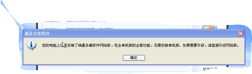 我的电脑安装的是网络版的瑞星2008版杀毒软件,防火墙是单机版的2008版,今天升级防火墙的时候,提示"您的电脑上已经安装了瑞星杀毒软件网络版,包含单机版的全部功能,无需安装单机版。如果要升级,请直接升级网络版。”