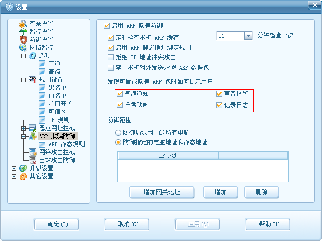 在ARP防御欺骗里可以设置防御范围,选择防御指定的电脑地址和静态地址,只把网关地址加进来就成了。然后在静态规则里添加网关即可。