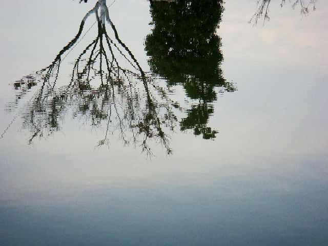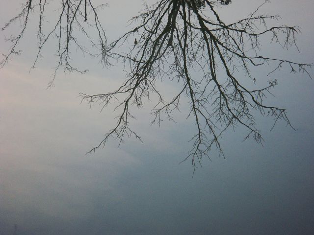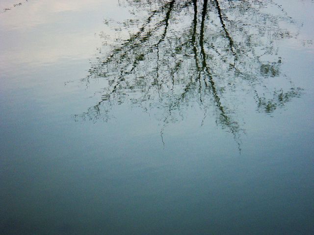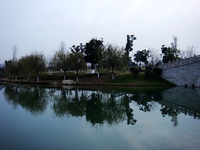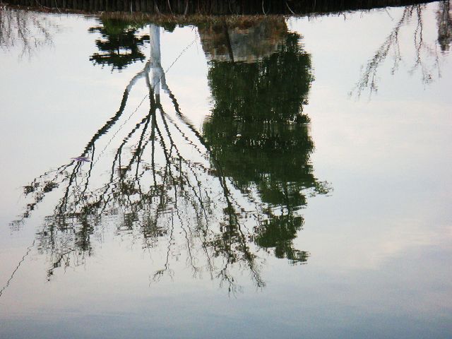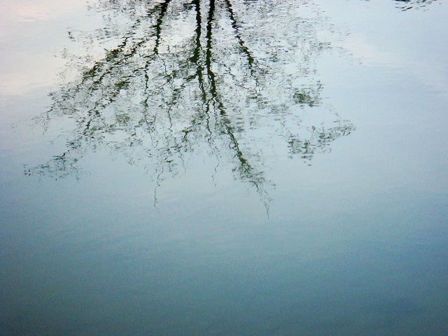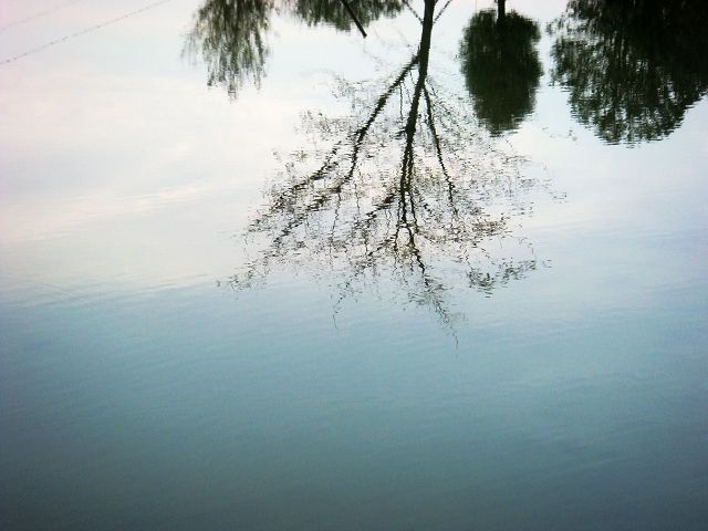 虽然已是冬天的傍晚,但是河岸树木等物体在水中的倒影依然清晰可辨