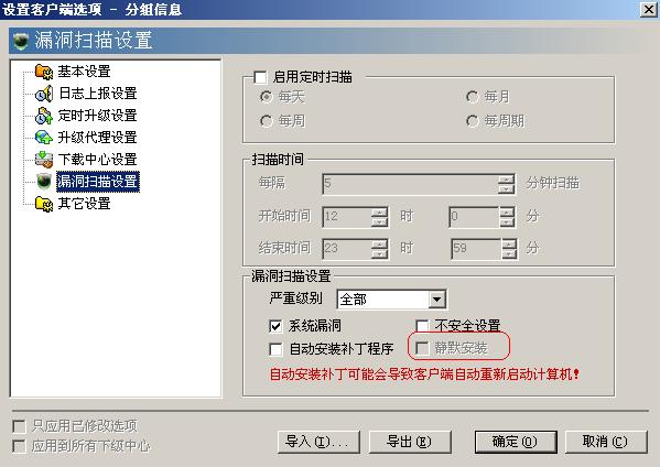 现在的问题是,由于客户端都是自动从系统中心下载安装补丁,有些客户端又不能自动安装补丁,相关的服务又都已经启动了,真是不知道是什么原因:default2: ,我就想能不能在客户端直接手动安装系统中心上已经下好的补丁,问题是瑞星客户端软件的扫描漏洞程序里的补丁链接都互联网上的链接,在没连接互联网的内网客户端根本不能下载:default8: 。我们公司的外网也购买了一套瑞星杀毒软件,也是江西电力行业专用版,因为能上互联网,就不存在这种问题。