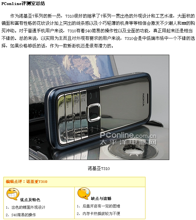 就在我们都把眼光投向N78、N96等年度大作的时候,一款定位于中低端的手机7310在未在国内正式发布的情况下于本月悄然上市,非常低调。也正式这种低调,反而引起我们对7310c的兴趣。我们PConline评测室也一如既往在最短的时间内拿到了7310c零售版真机,为网友们送出第一手的评测试用报告。
