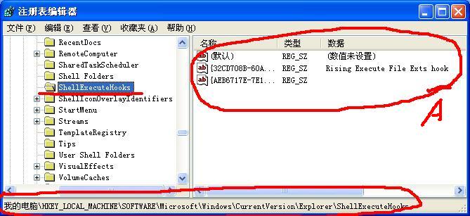 自己进入注册表编辑器,找到[HKEY_LOCAL_MACHINE\SOFTWARE\Microsoft\Windows\CurrentVersion\Explorer\ShellExecuteHooks]这个注册表项,单击后,看看右边A处有啥东西(如下图,请提供完整截图,A处的名称、类型、数据均要显示完整,如果无法显示完整,请自行记录用帖子发上来):