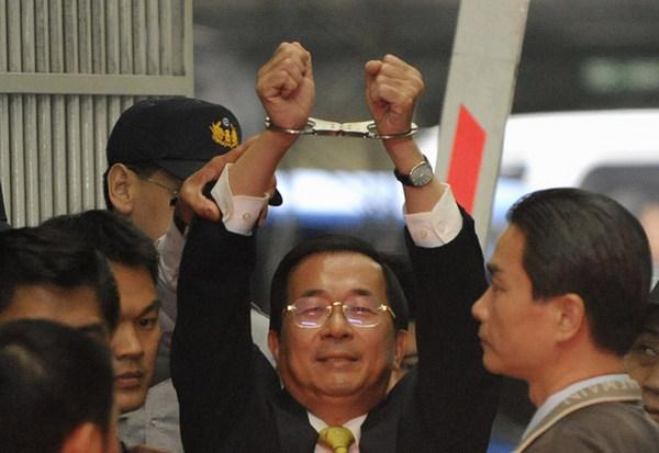 11月11日,台湾前总统陈xxx在台湾最高法院检察官办公室外举起双手显示他被戴上的手铐。
