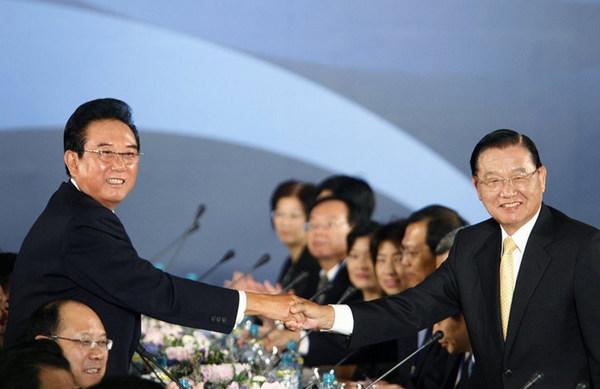 11月4日,众所瞩目的台北“江陈会谈”在台北宾馆举行,海基会会长江丙坤(右)和海协会会长陈云林(左)致词完毕后,再次应媒体要求进行第二度握手。