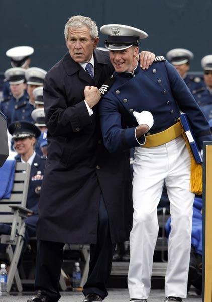 5月28日,美国总统乔治-W-布什在位于科罗拉多春天城的空军学院毕业典礼上与一位毕业生合影留念。