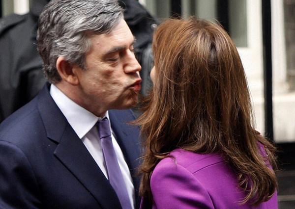 3月27日,唐宁街10号,英国首相布朗用著名“熊式”吻法迎接来访的法国第一夫人布吕尼。