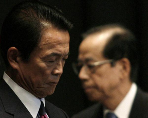 9月3日,宣布辞职的日本首相福田康夫离开自民党议会时,自民党总裁麻生太郎闭上了眼睛。