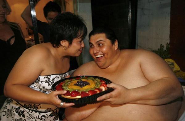 6月11日,全球最胖的男子乌里韦举着水果蛋糕与女友克劳迪娅-索利斯在屋外庆祝他43岁的生日。