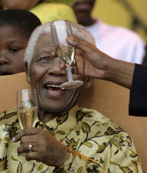 8月2日,在南非首都比勒陀利亚的洛夫特斯体育场举行的前总统曼德拉90岁生日庆典上,曼德拉与现任总统姆贝基举杯庆祝。