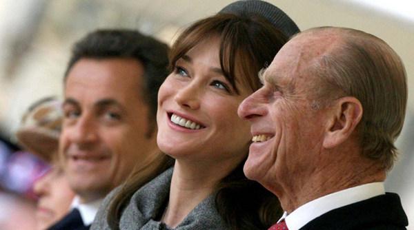 3月26日,英国菲利普亲王(右)与女王伊丽莎白(左)以及前来到访的法国总统萨克奇与第一夫人卡拉-布吕尼(右二)在温莎城堡检阅仪仗队。