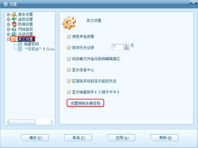 想要自行添加“排除杀毒目标”,可以打开“设置”——“详细设置”——“其他设置”,点击“添加排除杀毒目标”