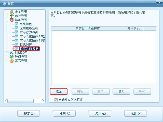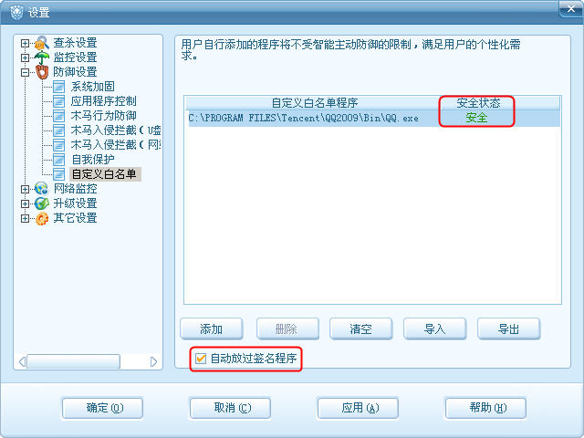 与杀毒白名单不同的是,防御白名单只能添加程序,不能添加目录,同时列表中的程序会显示安全级别。另外,为了减少不必要的防御提示,建议将“自动放过签名程序”打勾。