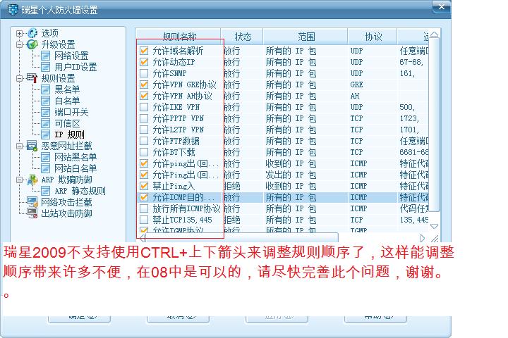 瑞星2009不支持使用CTRL+上下箭头来调整规则顺序了,这样能调整顺序带来许多不便,在08中是可以的,请尽快完善此个问题,谢谢。。详见附件。。。