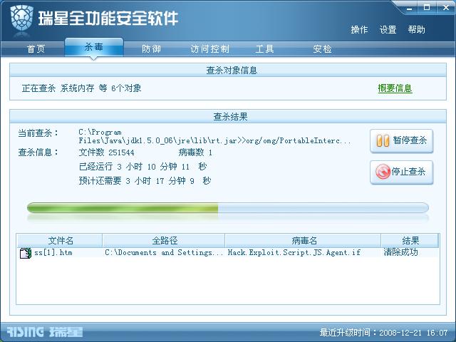 软件右下角的最近升级时间为2008-12-21 16:07!那时我还在考试啊!问过了都说没人那个时候开机,机器时间也是正确的,怎么回事呢?
