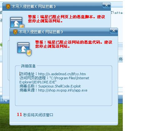 机器已经中了毒,那个网站是恶意网站,里面挂了马,看瑞星提示好像网页加密是采取的shellcode加密:default3: