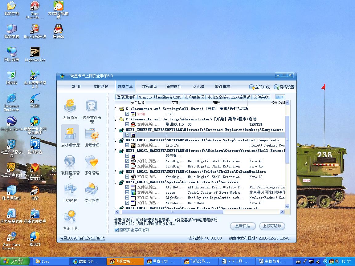 附带说一下,启动项管理表里上方那个显示未知红字的.BAT文件不算问题文件,那是前一阵瑞星杀软下载版漏洞扫描发现我重装的盗版系统被设置了硬盘分区根目录的共享,我向论坛的高手请教,署名银色灰烬的高人给我说让在开始菜单的启动里设置的一个文件,即在被共享文件后加/DELETE,每次开机自动清除共享用的。