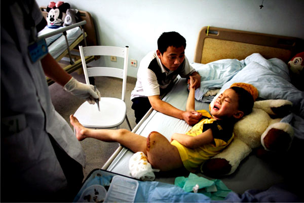 6月2日,四川省成都市,一名叫做张鹏的7岁男孩正在父亲的陪伴下接受医生的治疗。在5月12日的大地震中,张鹏不幸失去了自己的左腿。(图片来源:美联社)