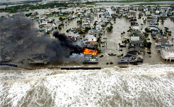 9月12日,随着飓风艾克的袭来,大火毁掉了一栋位于德克萨斯州格拉斯顿岛海滩的房屋。第二天,飓风中心便袭击了格拉斯顿市北部地区,造成了严重的损失。许多撤离格拉斯顿岛的居民在近两周的时间里无法回到自己的住宅。(图片来源:美联社)