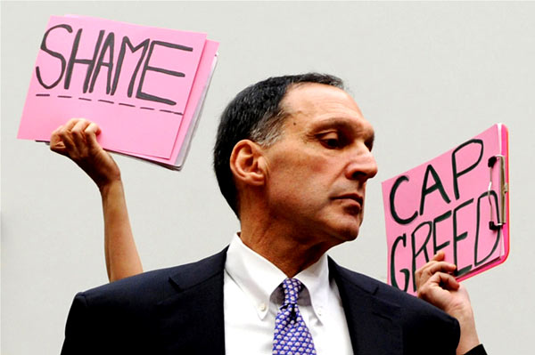 抗议者在雷曼兄弟控股公司总裁兼首席执行官理查德-福德的背后举起了写有“羞耻”及“贪婪”的标识牌。10月6日,福德在华盛顿参加众议院监管和政府改革委员会举行的听证会,来对雷曼兄弟破产的原因与影响进行作证。(图片来源:路透社)