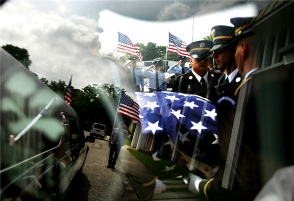 8月8日,阵亡的乔舒亚-亚历山大-莫利纳的棺木被从圣-马修斯-艾皮斯库教堂中抬出,准备运往休斯顿国家公墓。5天前,莫利纳在爆炸袭击中受伤而在伊拉克巴格达阵亡。(图片来源:《休斯顿纪事报》)