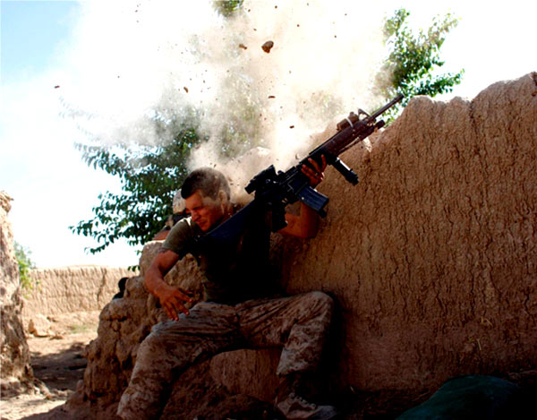 5月18日,在阿富汗的赫尔曼德省,一位美国海军陆战队士兵躲过了塔利班武装人员的攻击。他并未受伤。(图片来源:路透社)
