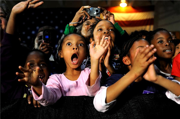 1月23日,奥巴马在南卡罗来纳州对公布发表讲说。从左至右分别为8岁的沙尼斯-斯布拉丁,5岁的伊洛纳-库珀,10岁的伊玛尼-库珀,8岁的印迪亚-库珀,10岁的希拉-麦克尼尔。在那一周,奥巴马在南卡罗来纳州进行自己的初选之旅。(图片来源:Polaris)