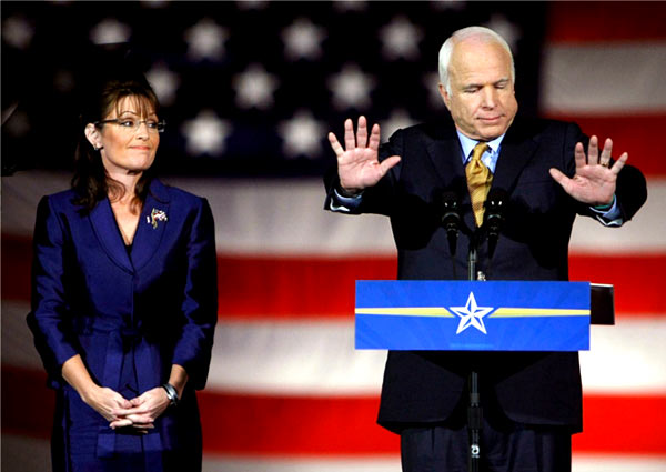 11月4日,在自己的竞选搭档、阿拉斯加州州长萨拉-佩林的陪伴下,美国总统候选人约翰-麦凯恩在菲尼克斯市向支持共和党的民众讲话。他承认自己在大选中输给了奥巴马。(图片来源:路透社)